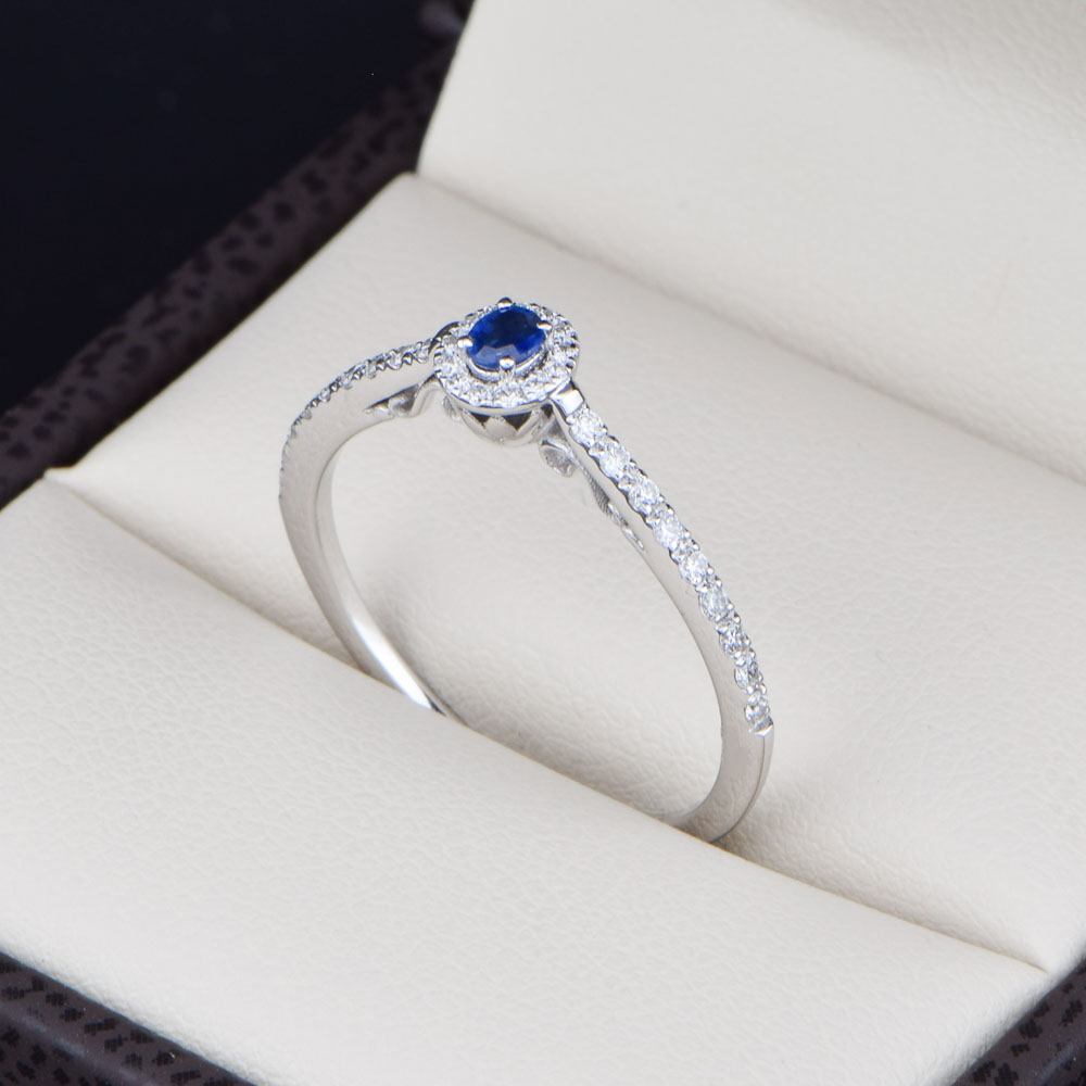 Anillo de compromiso Oro 14k con Halo Diamantes y Zafiro