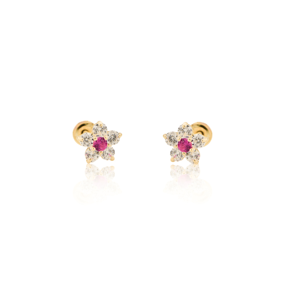 Dormilona de flor en oro 14k con zirconia roja con rosca para bebe